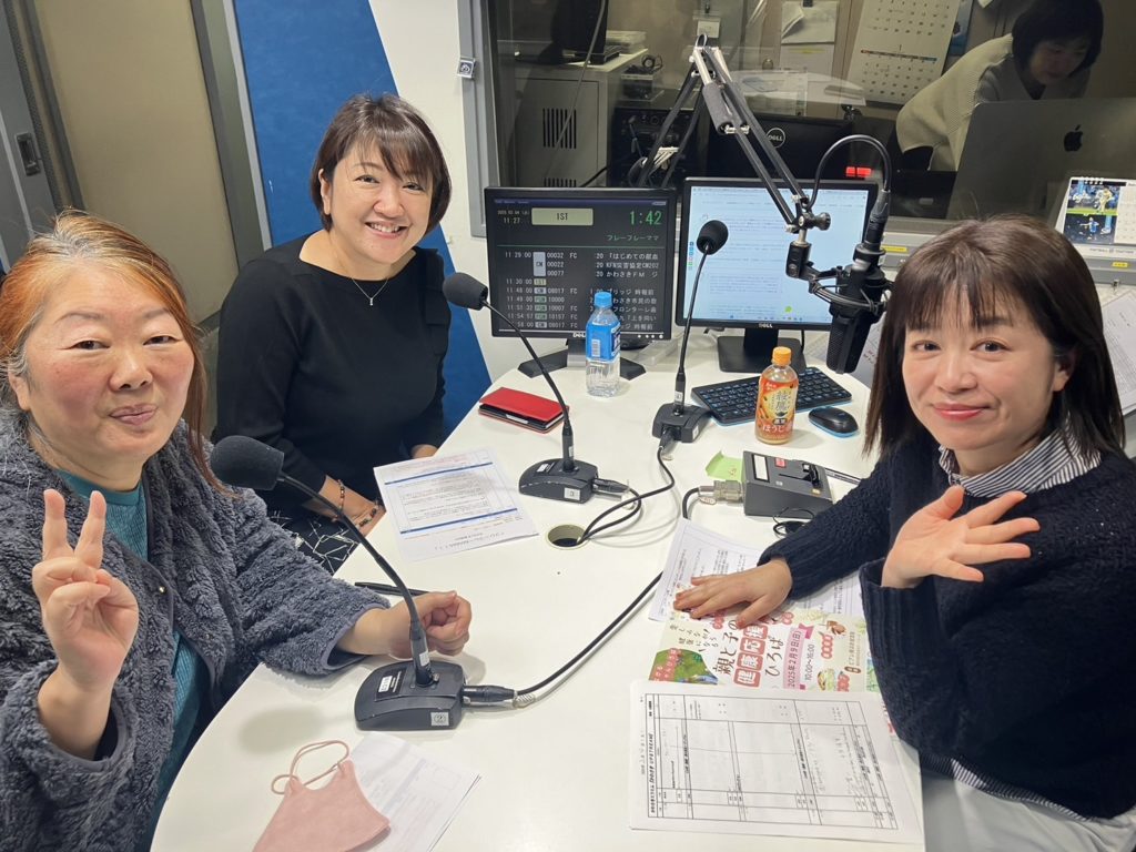 左から当協会代表理事武次、はなさく生命保険株式会社山崎さん、パーソナリティーの山根さん